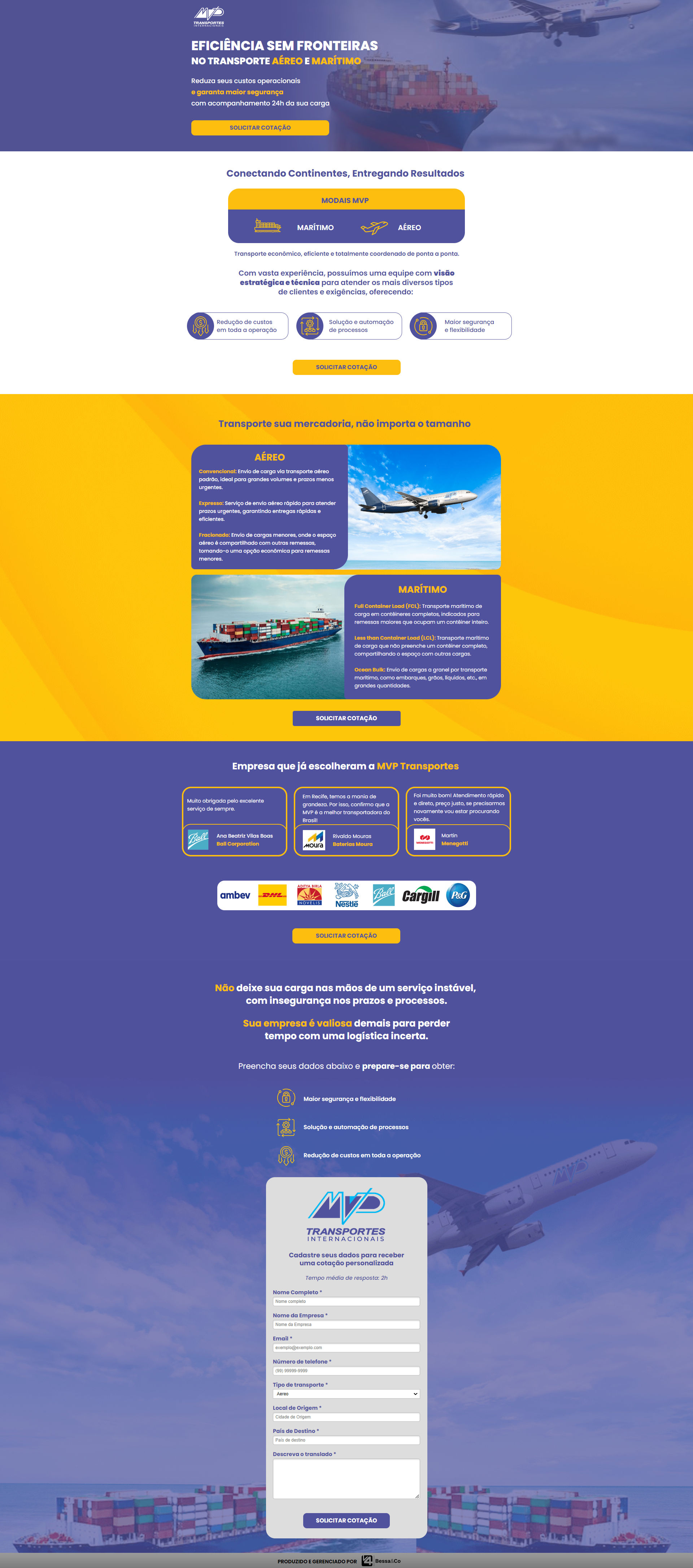 Criação de Página de Captura para empresa de Transportes Internacional, com foco em Aéreo e Marítimo.